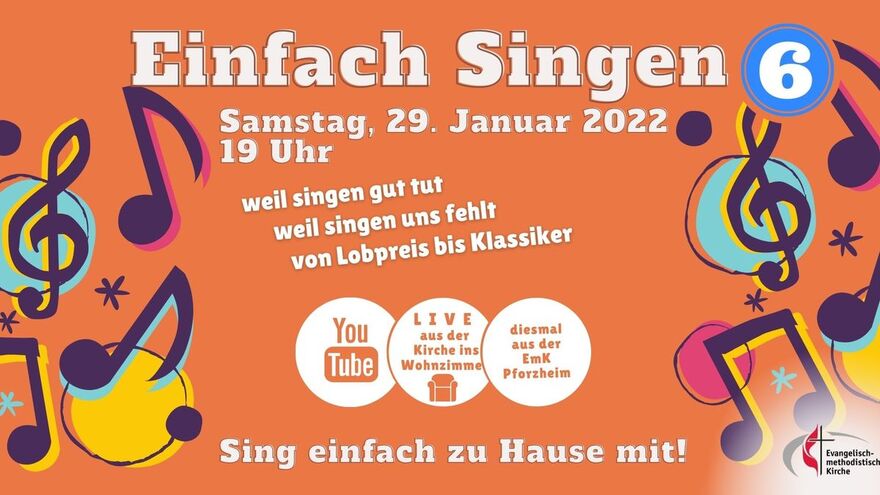 Singen Sie mit - Einfach Singen 6 am 29. Januar 2022 aus der EmK-Gemeinde Pforzheim! Wir freuen uns auf Sie!