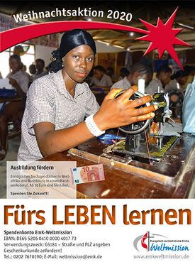 Wie in jedem Jahr hat das Missionswerk der Evangelisch-methodistischen Kirche, die "EmK Weltmission", ein Hilfsprojekt für die Weihnachtsaktion 2020 ausgewählt. Unter dem Motto "Fürs LEBEN lernen" sollen in der Weihnachtszeit (und darüber hinaus) Spendengelder gesammelt werden, die verschiedenen Ausbildungsprojekten in Westafrika zugute kommen. Diese Projekte ermöglichen es jungen Frauen und Männern, einen Ausbildung in einem handwerklichen Beruf zu erlernen und sich hierdurch eine Selbständigkeit aufzubauen.
