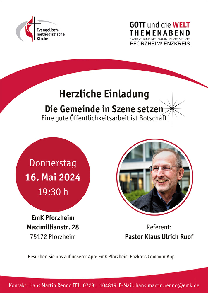 Pastor Klaus Ulrich Ruof (65; verheiratet, vier erwachsene Kinder) ist Referent für Öffentlichkeitsarbeit der Evangelisch-methodistischen Kirche. Als studierter Theologe und EmK-Pastor verband er zwanzig Jahre lang seine praktische Gemeindearbeit mit der Suche, wie Kirche in der Öffentlichkeit wahrgenommen werden kann. Als Quereinsteiger wurde er in die Öffentlichkeitsarbeit der EmK in Deutschland berufen, die er inzwischen seit fast zwanzig Jahren mitgestaltet. Gerne teilt er seinen Erfahrungsschatz für die kreative Kommunikation des Evangeliums.