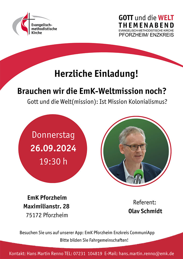 Die Reihe „GOTT und die WELT Themenabend“ wird von den fünf Evangelisch-methodistischen Bezirken im Verbund Pforzheim/Enzkreis gestaltet.