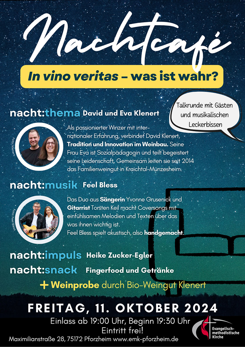In Pforzheim findet für die Verbundgemeinden und als offener Einladungsabend das 2. Nachtcafé statt. Thema des Abends ist "Wein - in vino veritas - was ist wahr?". Die Gäste sind David und Eva Klenert vom Familienweingut Klenert in Kraichtal-Münzesheim. Das Duo Feel Bless gestaltet den Abend mit hochkarätiger Musik.