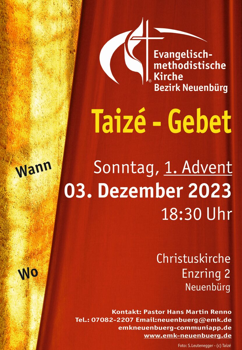 Am ersten Advent, Sonntag, 03.Dezember 2023 feiern wir um 18:30 Uhr nach langer Pause wieder ein Taizé-Gebet.