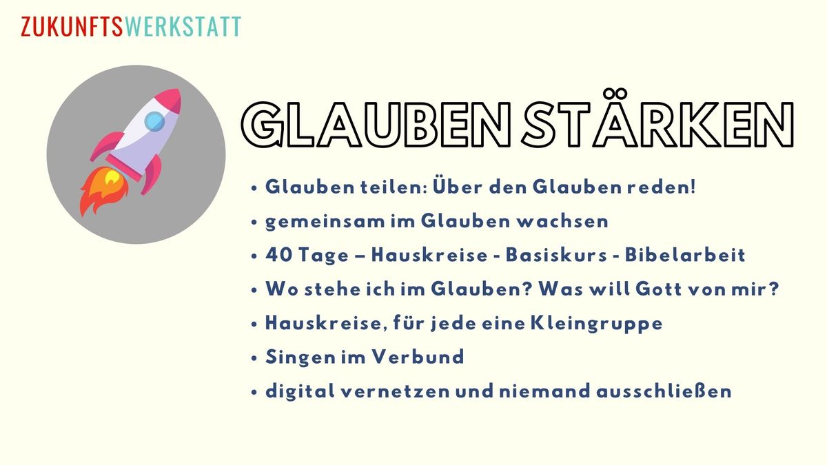 Bring Dich ein und gestalte mit! Welche Schwerpunkte wollen wir in der kommenden Zeit setzen? Was ist unser Auftrag in unserer Stadt? Mit welchen Aktionen sprechen wir Menschen an und gewinnen sie für den Glauben an Gott? Bring Dich ein und gestalte mit in der "Zukunftswerkstatt Gemeinde".