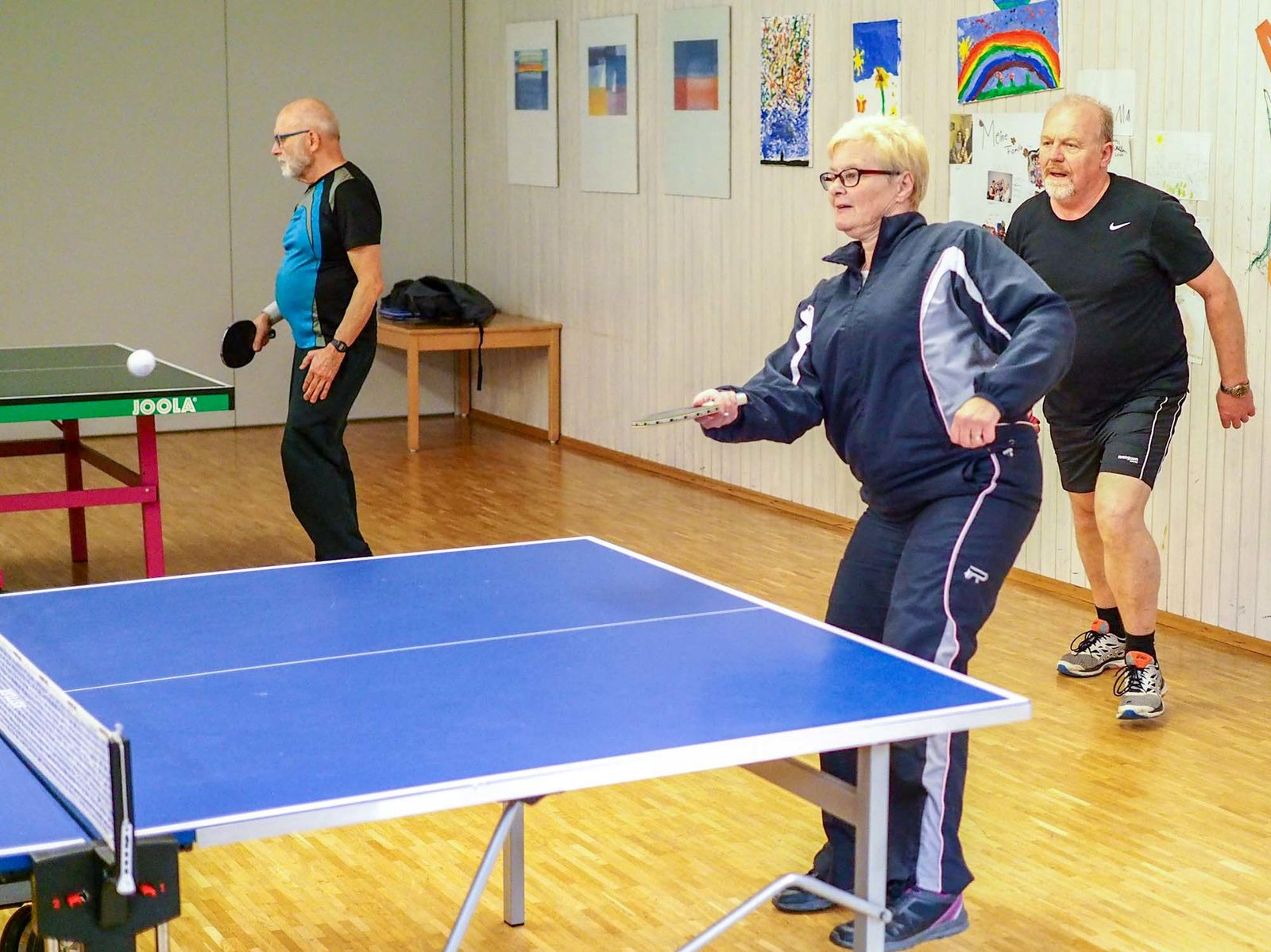 Wir sind eine fröhliche Gruppe von 12 jungen Frauen und Männern zwischen 22 und 75 Jahren, die große Begeisterung fürs Tischtennisspielen haben. Deshalb treffen wir uns jede Woche am Montagabend in der Kirche, um uns an den Platten zu verausgaben. Meistens spielen wir Doppel an maximal drei Tischtennisplatten. Wir wechseln permanent durch, damit jede mit jedem spielen kann. Dabei steht eindeutig der Spaß im Vordergrund – verlieren macht bei uns niemandem etwas aus ….normalerweise…